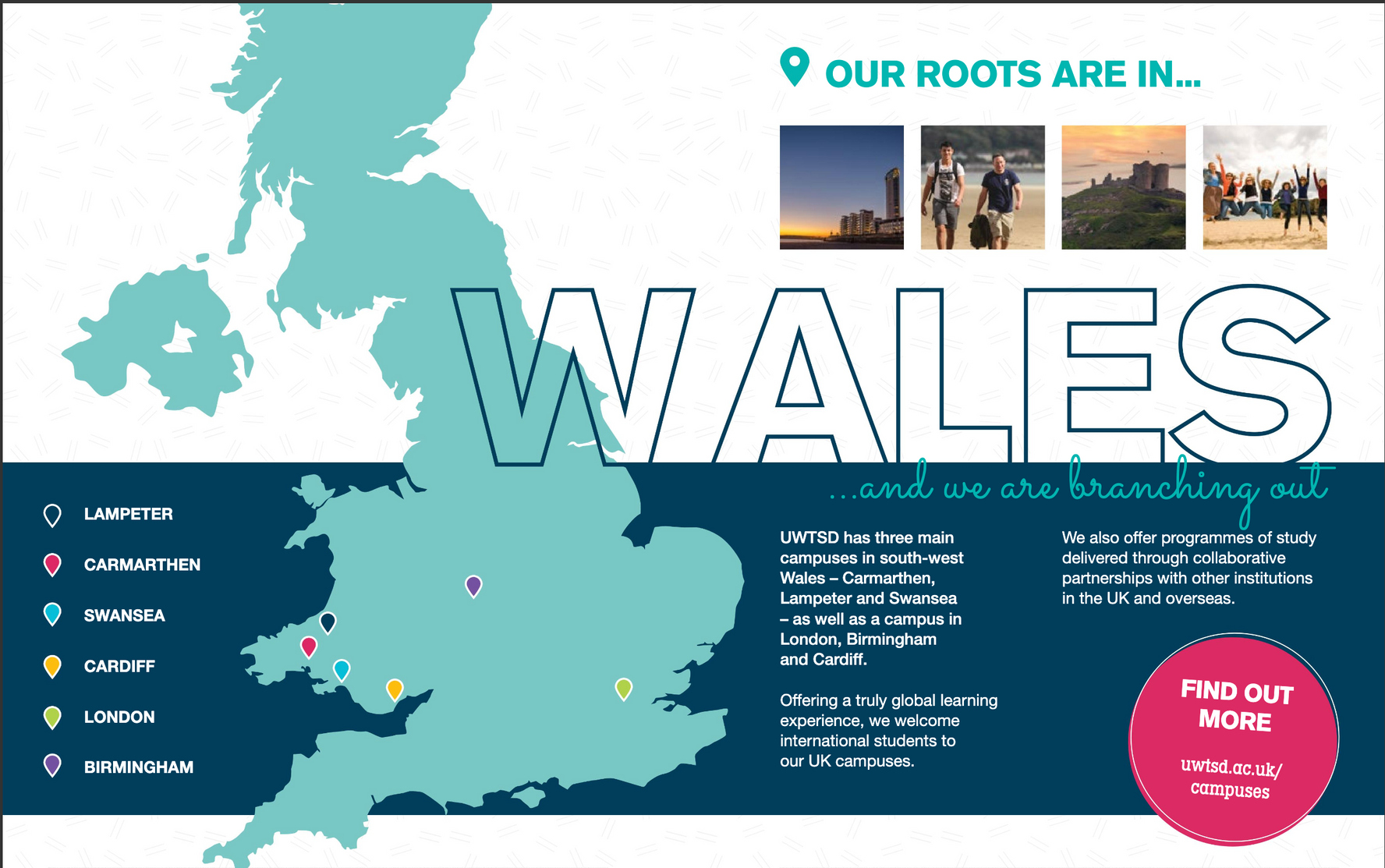 UWTSD has 3 main campuses in southwest Wales in South West Wales, as well as a campus in London and learning centres in Cardiff and Birmingham.